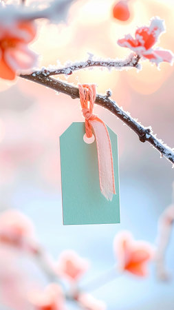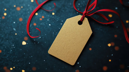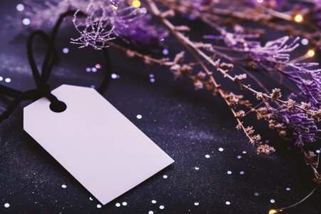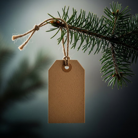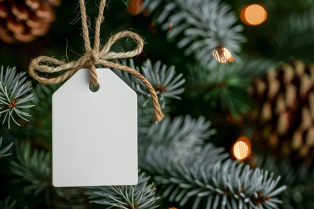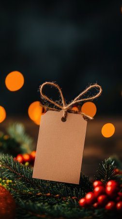 A blank gift tag decorated with twine, surrounded by festive greenery and warm bokeh lights, perfect for holiday celebrations.