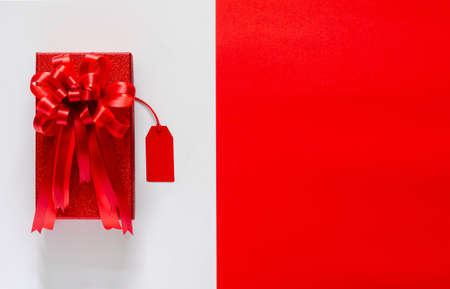 Red christmas box with red bow ribbon and price tag on white and red background. Black Friday and Cyber Monday concept.