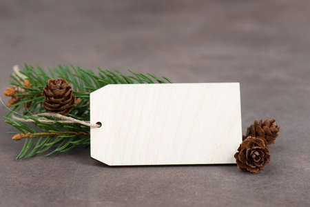 Empty sign with christmas decoration, branch of fir and cones, textured brown background