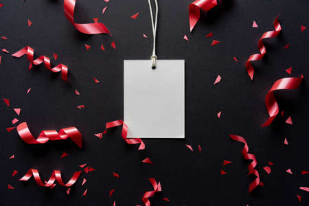 close up top view on blank white tag paper with rolling ribbon and confetti on black background with copy space for merry christmas, happy new year festival and black friday sale season concept