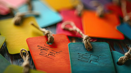 A vibrant collection of colorful craft tags displayed on a textured dark surface, perfect for creative projects, gifts, or artistic styling.