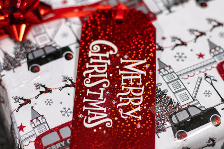 Close-up of a Christmas gift wrapped in white paper featuring London-themed illustrations (black cabs, buildings), adorned with a red glitter gift tag reading Merry Christmas.