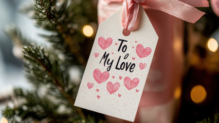 A close-up of a gift tag attached to a Valentine's Day present, reading To My Love with heart illustrations.