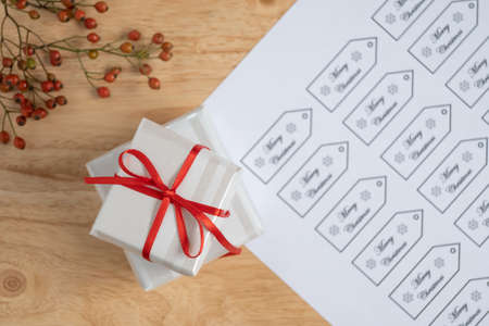 Christmas gift tag mock up with gift box wrapped in craft recycled paper with red ribbon bow on a white backgroud