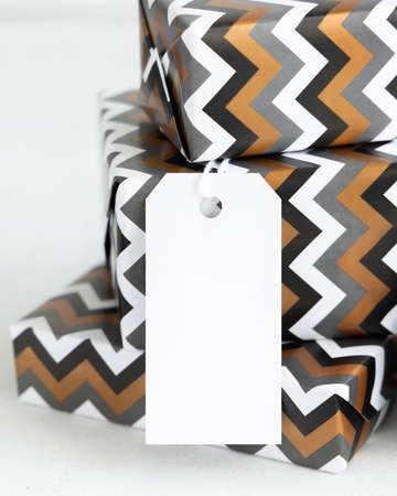 Presents with blank vertical gift tag close up. Gift boxes wrapped in chevron geometric paper. Christmas, New Year, Birthday, Anniversary label mockup