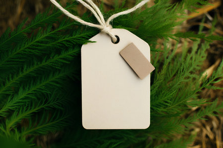 A blank kraft tag surrounded by evergreen branches, ideal for gift wrapping or holiday decorations.