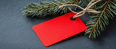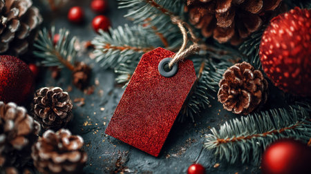 Red tag with pine branches on dark surface, perfect for holiday decoration.