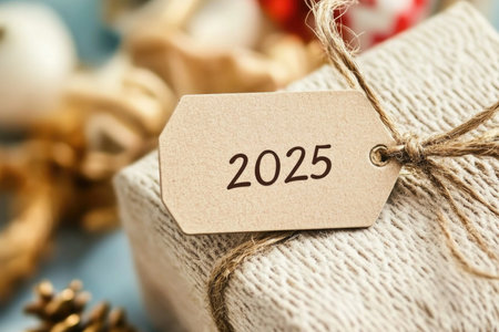 Rustic gift box with 2025 tag wrapped in jute string for new year celebrations.