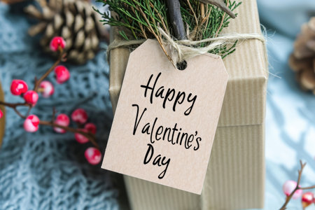 Wrapped gift with a tag placed on a dark surface alongside pine branches. Perfect for holiday themes and seasonal celebrations.