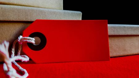 Cardboard boxes with a tag. Brown packing box with blank label and copy space on red backdrop.