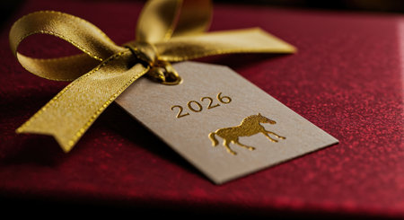 A close-up view highlights the textured deep red wrapping of a festive present, elegantly tied with a shimmering gold bow and a special tag for the Year of the Horse 2026.