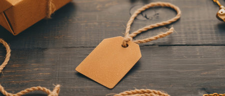 A blank brown tag with a twine loop, resting on a rustic wooden surface, ideal for labeling gifts or organizing items.