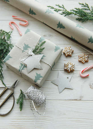 Gift in craft paper for Christmas and New Year. Holiday gift wrapping concept. Flat lay