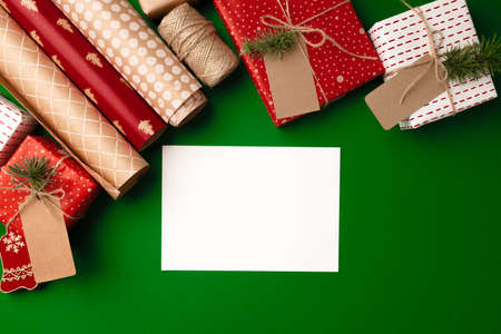 Rolls of wrapping paper, package gift boxes, present eco rope on green vintage table. Creative preparation for holiday. Flat lay, top view concept with copy space.