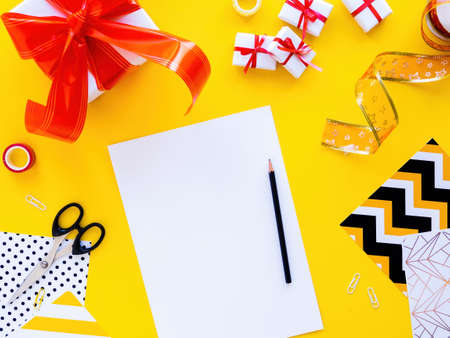 Table with things for preparing gifts, gift boxes, tapes, stationery. Yellow background. Holiday concept. Top view