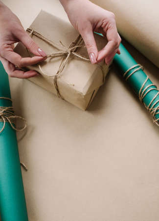 woman hand tie a bow on a gift box. Rustic wrapping creativity art concept