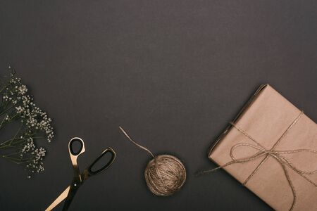 Top view of craft christmas gift with scissors, flowers and twine on black