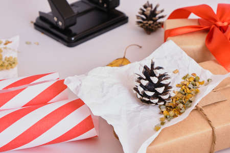 Red and kraft christmas gifts surrounded with pine cones, leaves and twine on a wooden table.