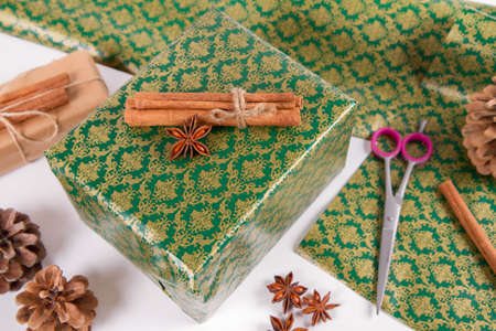 Wrapping christmas gifts in green wrapping paper with cinnamon, anise and pine cones