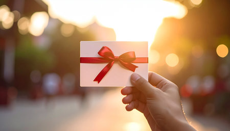 A hand presents a white gift card with a festive red ribbon and bow, illuminated by soft sunlight in a blurred outdoor environment.