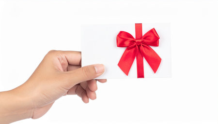 A hand presents a white card featuring a red ribbon tied into a bow, set against a clean white backdrop.