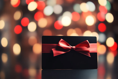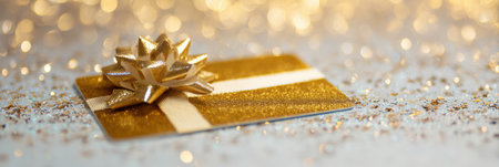 Gift card featuring a glossy finish and a decorative bow rests on a glittering surface, capturing the essence of celebration and giving during festive moments.