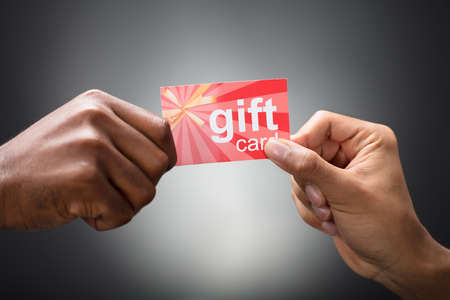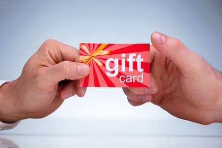 Close-up Of Two Hands Holding Gift Card Against Gray Background