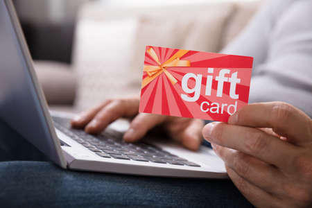 Man Holding Red Gift Card While Typing On Laptop Keypad