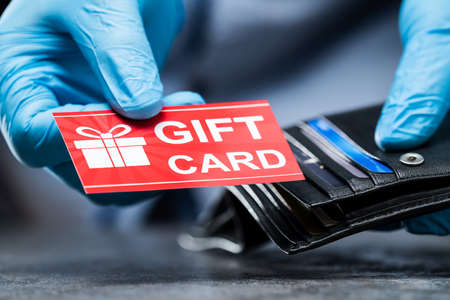 Consumer Taking Gift Card From Wallet In Gloves To Protect From Coronavirus