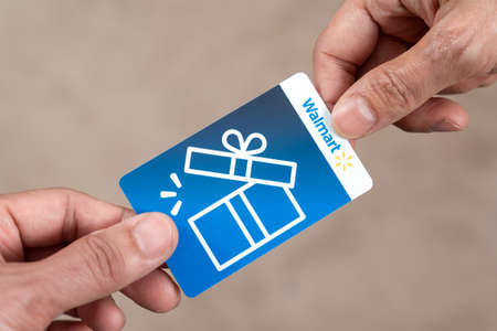 Detroit, USA - May 31, 2022 : Hand giving out a Walmart color gift card to another person isolated