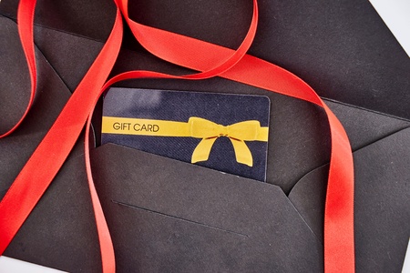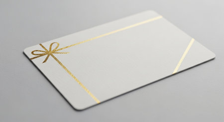Gift card showing a white gift card with a golden ribbon tied in a bow placed on a textured gray surface, showcasing...