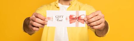 Cropped view of man holding gift card on yellow background, panoramic shot