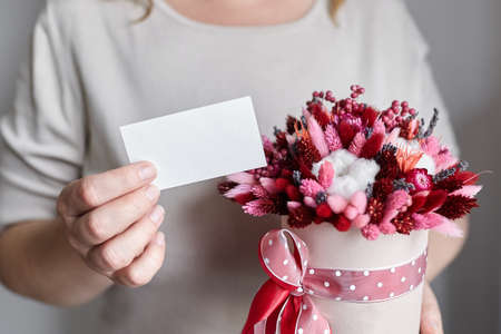 Greeting or business card mockup and dried flower bouquet in woman hands
