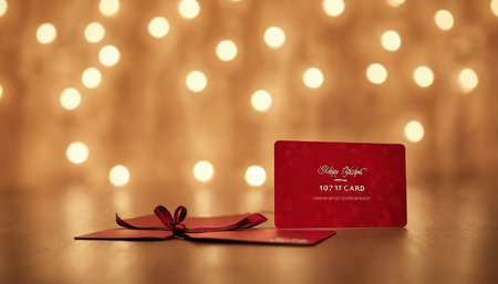 A golden gift card is resting on a glittery surface with festive decorations around it creating a joyful atmosphere.