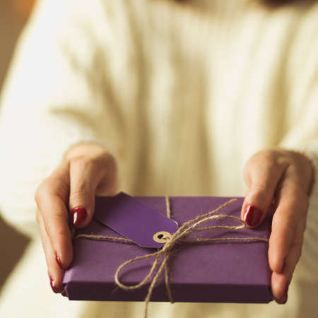 Closeup of woman's hands with nice gift box. Present for birthday, Christmas or any other celebration.