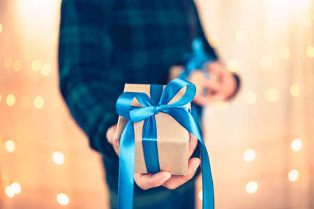 gift giving,man hand holding a gift box in a gesture of giving.blurred background,bokeh effect