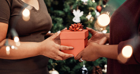 With good friends youve got the greatest gift of all. two unrecognisable women exchanging gifts during Christmas at home.