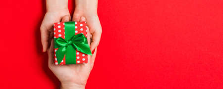 Top view of male and female hands holding red gift box with gold ribbon on red background. Gift for Christmas, New Year. Congratulations background copy space.