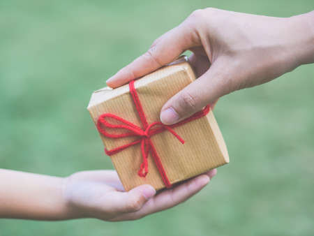 gift giving,man hand holding a gift box in a gesture of giving.blured background,vintage effect