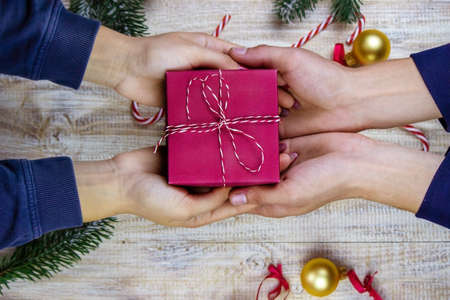 New Year's gifts in hands on a wooden background. Christmas selective focus