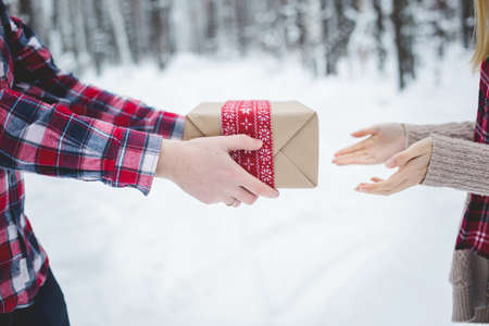 a young man presents women Christmas gift winter in the forest