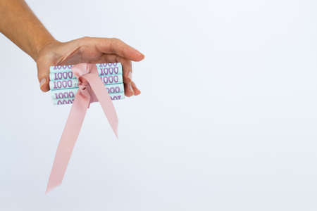 Hand giving ukrainian money in a roll with a ribbon.