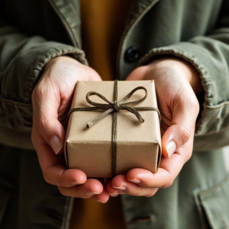 Person s Hands Presenting A Small Gift, Wrapped In Brown Paper, Tied With String, Close Up