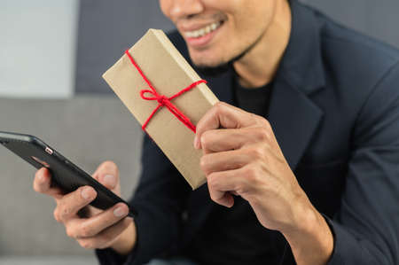 Close-up of a Thai man holding hands holding a gift box made of paper and tied with a beautiful bow with a gray canvas as a backdrop.