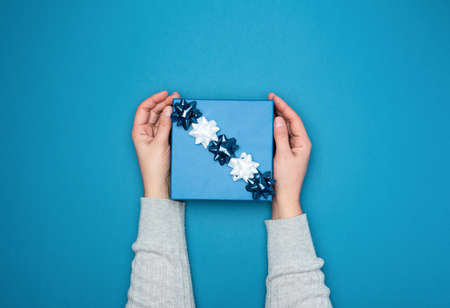 two female hands in a sweater hold a square blue box with a bow on a blue background, top view, festive backdrop