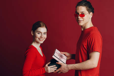 A present giftbox with red ribbon in hands. Happy couple in love. A young loving couple celebrating Valentine's Day. Couple give each other gifts. Valentine's day concept