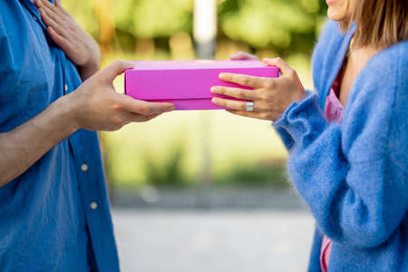 Man gives a gift to his woman, close-up on a pink box. Celebrating anniversary, thanksgiving day, valentine or birthday concept
