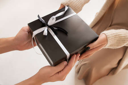 Male and female hands passing decorated gift on black