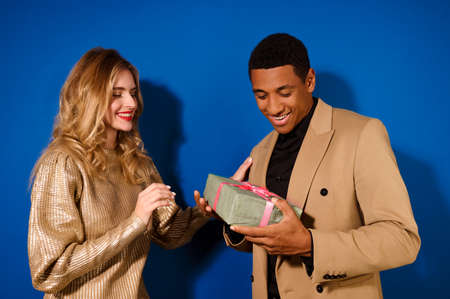 Close up beautiful couple in love on blue studio background. Saint Valentines Day, love, relationship and human emotions concept. Copyspace. Young man and woman giving one another gift boxes.