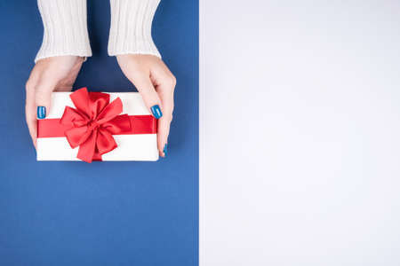 Gift box with a red bow on a gray and blue background in womens hands. Space for text.